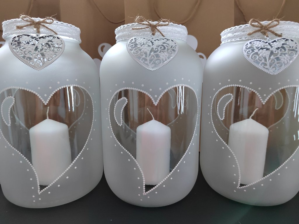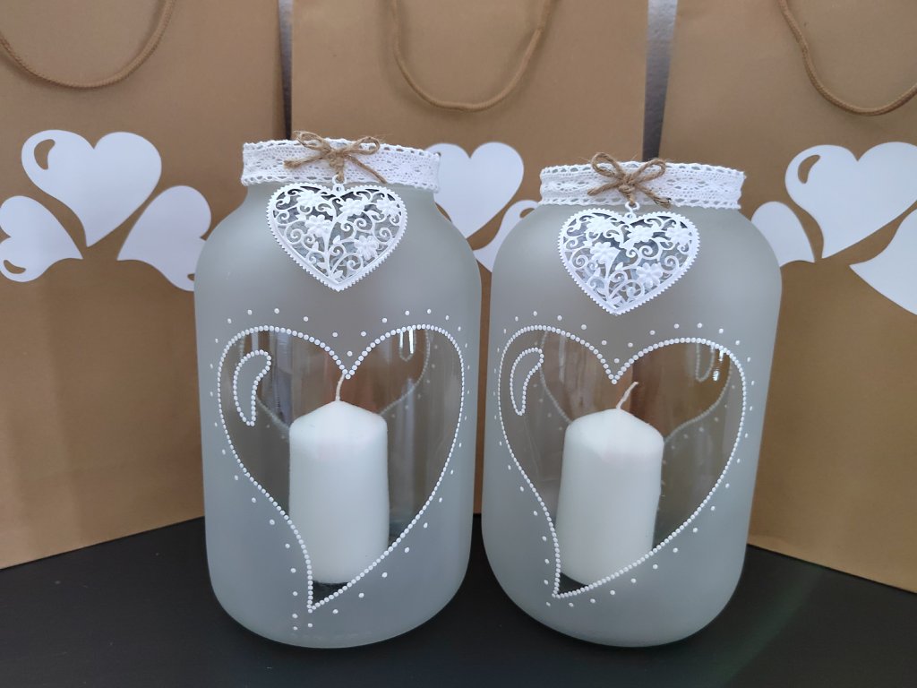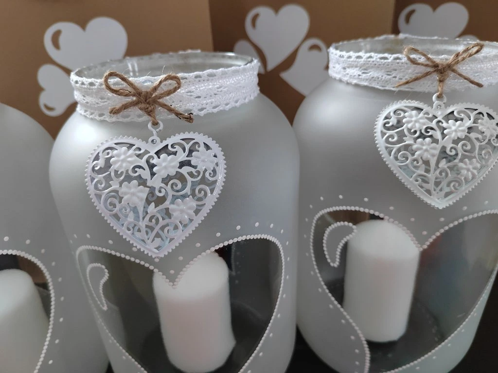 Pískovaná skleněná lucerna s kovovým srdcem je elegantní dekorace, která okouzlí na první pohled. Jemně matné sklo s motivem srdce a ruční malbou , vytváří při rozsvícení nádhernou hru světla a stínů. Součástí balení je bílá svíčka i LED světýlka, díky kterým můžete svítit dvěma způsoby – klasickým plamínkem pro autentickou atmosféru nebo bezpečným LED osvětlením vhodným i do domácností s dětmi. ✨